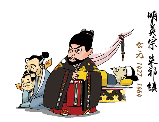 明英宗正统皇帝朱祁镇(1427-1464)是宣宗宣德皇帝长子,景泰皇帝朱祁钰同父异母的哥哥。他9岁即位,改元正统,做了14年的皇帝,在正统十四年(1449年)八月的土木堡之变中被瓦剌俘去。其弟朱祁钰即位,改元景泰,朱祁镇被尊为太上皇,并终于在景泰元年(1450年)结束了他的俘虏生涯回到北京。景泰七年(1456年),朱祁镇趁景泰皇帝病重,发动“夺门之变”,把弟弟赶下台,自己重新当上了皇帝,改元天顺。天顺皇帝复辟后,杀害抗击瓦剌、保卫北京的功臣于谦等人,重用宦官曹吉祥等,在天顺朝的8年时间里,朝政无大建树。他前后在位共22年,在死前终于做了一件好事,将残忍的宫妃殉葬一条取消了。