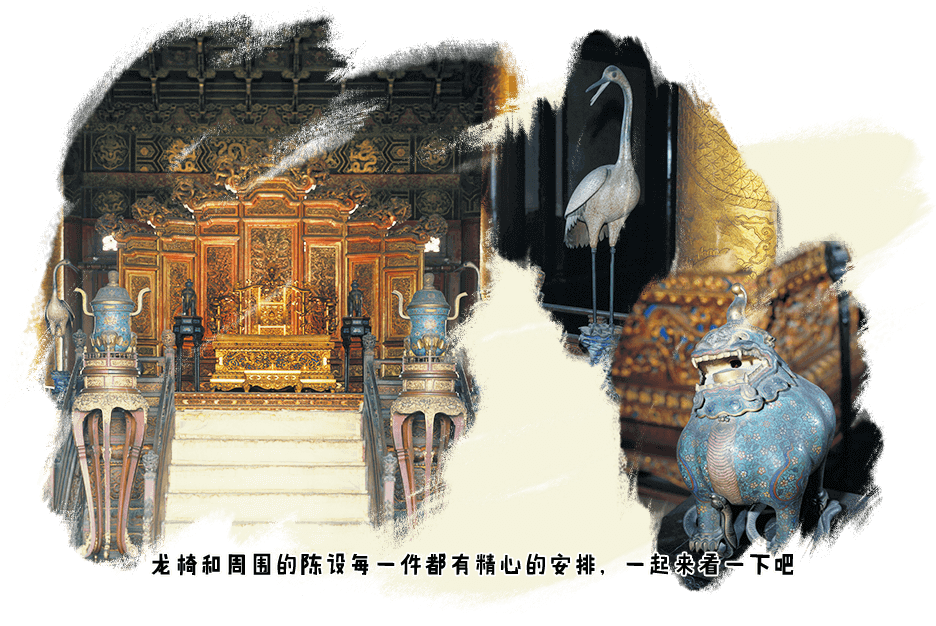 龙椅作为皇帝的宝座,常常是选用名贵材料,经过能工巧匠的精雕细琢制作而成。雕龙髹金大椅由最珍贵稀有的金丝楠木制成,有一个圈椅式的椅背,上面精细地雕刻着13条栩栩如生的金龙。你知道吗?在过去,龙可是只有皇家才能使用的图案。龙椅背后是高大宽阔的雕龙髹金屏风,周边对称陈列着仙鹤、香炉等礼器,尊贵无比,使整个大殿显得更加金碧辉煌,别提多气派了!