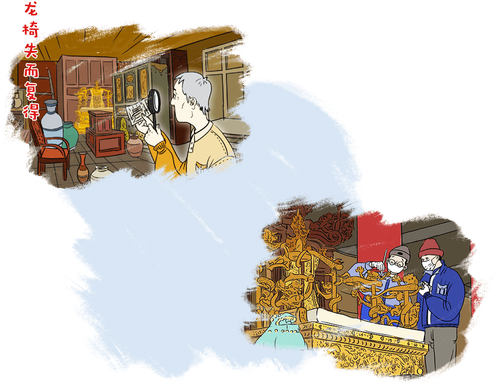 1959年,朱家溍根据一张旧照片上太和殿的原貌,在一处存放残破家具的库房里,找到了伤痕累累的雕龙髹金大椅。