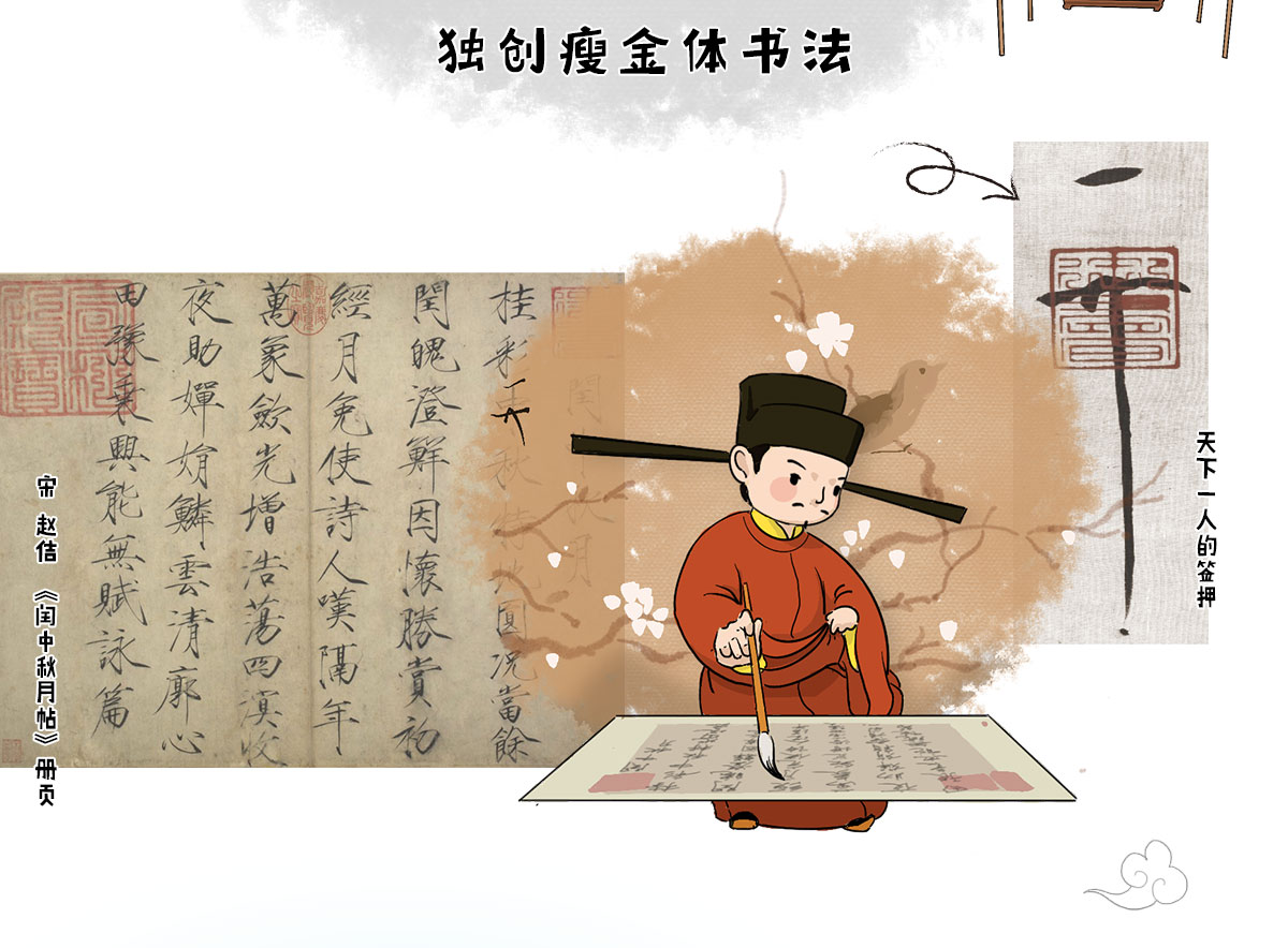 有一次,徽宗以“野水无人渡,孤舟尽日横”为试题,命画师作画,大多数人为了表现“无人”,就画一只空舟停在岸边。可是,画家宋子房与众不同,他画了一位船夫,正独自卧在船尾吹笛子,表达的不是小舟中无人,而是路上没有行人,周围的空旷更衬托了船夫的闲适。这种以别致的构思表达诗词意境,才是徽宗最赞赏的艺术表现方法。