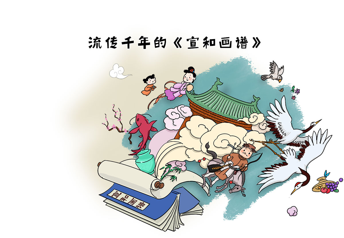 宋徽宗还热衷于充实艺术品的收藏,而且将宫廷所藏的历代著名画家的作品目录编撰成了一本书——《宣和画谱》。这本书可不只是作品目录那么简单,它还是一部传记体的绘画通史。书中收录的作品总计6396件,按照画的不同类别分为人物、山水、花鸟等共计10门。单单是著录还不够,每门画科前都会配有一篇短文,详细叙述该画科的起源、发展、代表人物等,然后按时代先后排列画家介绍和他们的作品,为后人研究北宋和北宋之前的绘画发展和作品留下了珍贵资料。除了《宣和画谱》,宋徽宗还组织编撰了宫廷所藏书法作品的著录著作《宣和书谱》,书中的内容同样精彩详尽,有很多资料依靠这本书保存了下来。