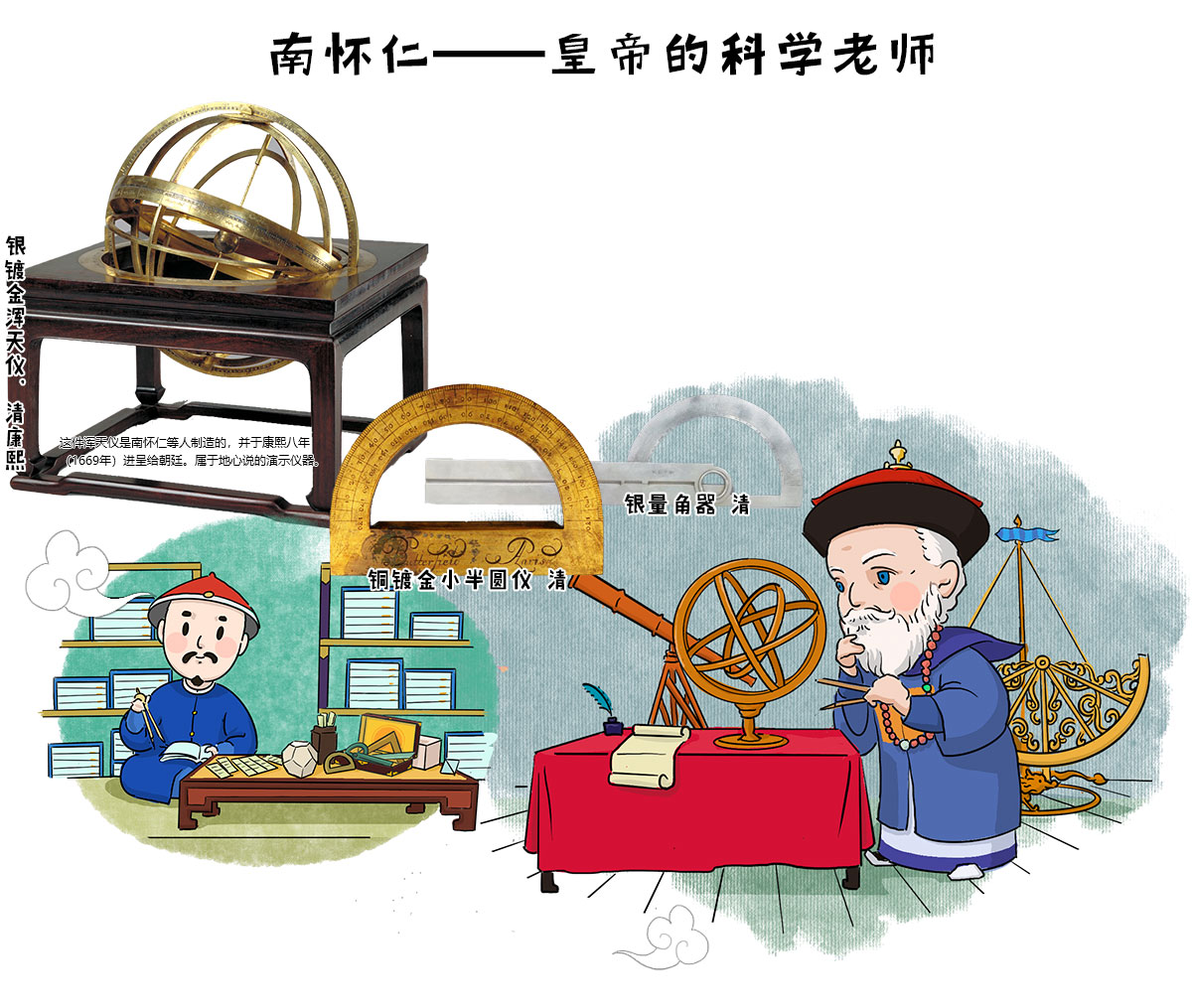 历法之争后,南怀仁被年轻的康熙皇帝召至内廷,以他所掌握的机械、天文、地理等西方科学知识为朝廷服务。他掌管钦天监期间改建了观象台,铸成六件大型天文仪器,安装在北京观象台上。作为皇帝的老师给皇帝讲授几何学和天文学,将《几何原本》译成满文,陪同皇帝出巡,沿途为皇帝观天测地。