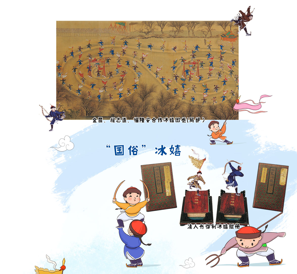 在东北的满族中间,滑冰很早就开始流行了。它既是娱乐活动,也是军事操练。清代随着满族入关,冰上活动也成为北方冬季最重要的体育活动之一,并有了“国俗”之称。你一定想不到,那时候,滑冰、足球和摔跤可是守卫京城部队的军事训练项目呢!每年冬天,皇帝都要通过观看军队滑冰,来检阅他们的训练成果。