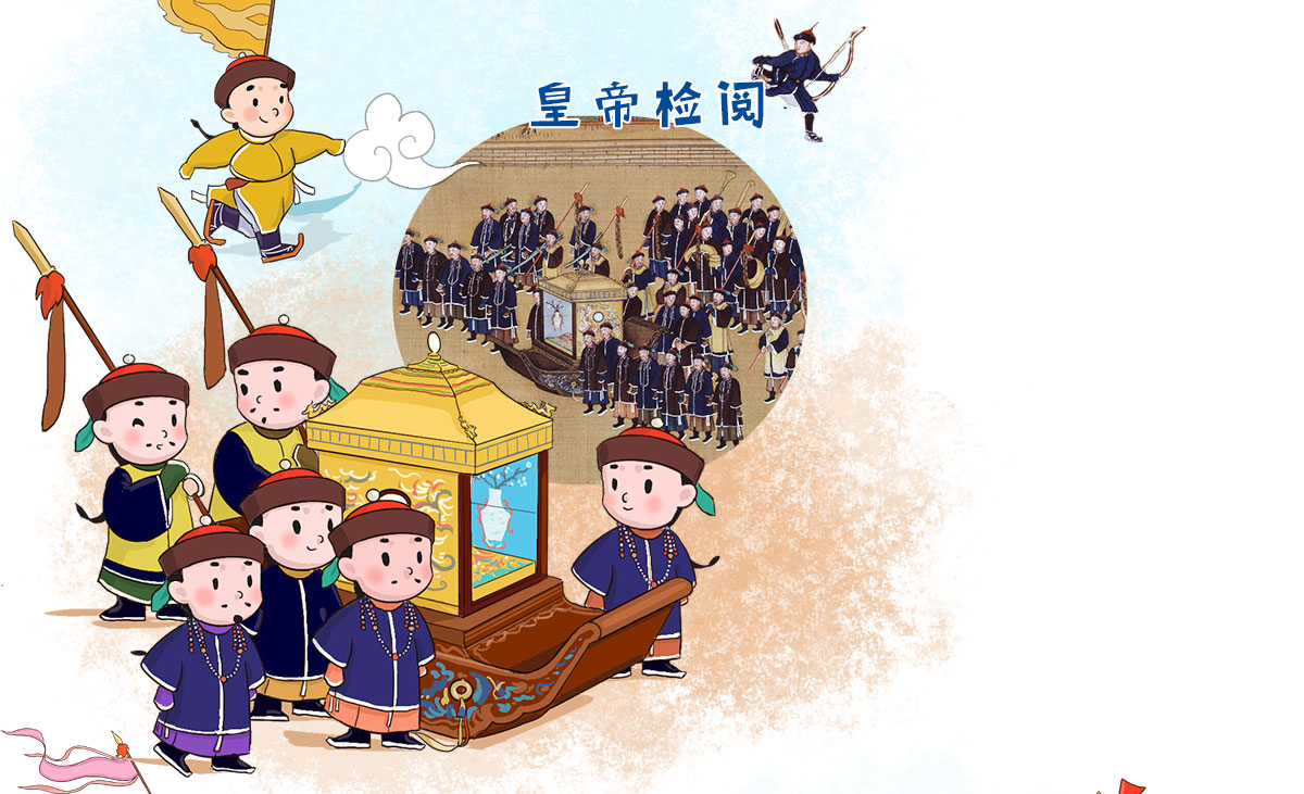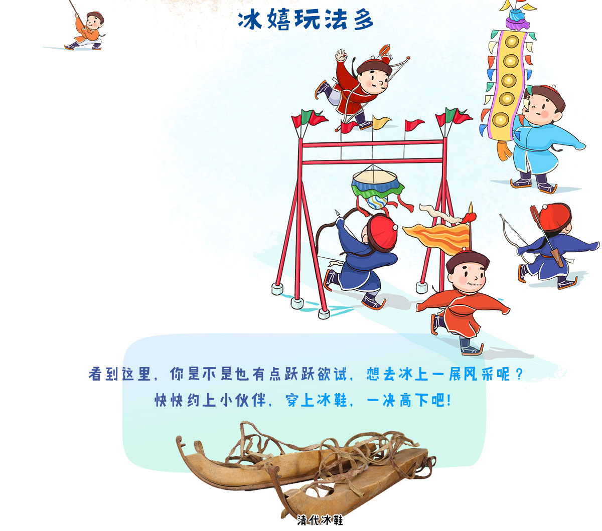 每年冬至以后,选手们就要开始集训。腊八前后,在西苑太液池上(即今北京南海、中海和北海)就要正式举行宏大热烈的冰嬉活动了。届时,会有一千四百多名选手参与表演。皇帝由王公贵族和文武百官陪同,亲临冰场,观看官兵们的冰上射箭比赛和冰嬉杂技表演。比赛时,皇帝坐在华丽的船形冰床上,四下有八旗军旅护卫,上千名冰嬉选手排好队形竞技表演,场面威武壮观。乾隆皇帝曾多次让画家把冰嬉的场面画成画。瞧!你现在看到的《冰嬉图》,描绘的就是清代冰嬉的场景。威严的皇家仪仗、奋力角逐的参赛选手、丰富有趣的冰嬉项目,像是观看了一场皇家的冰嬉“直播”呢!