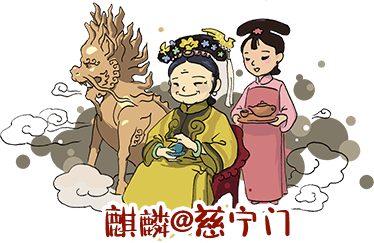 在慈宁宫的正门慈宁门前,有一对鎏金麒麟雄踞在路旁。它们麟发上耸、两目前视、昂首挺胸、威风凛凛。慈宁宫是皇太后、太妃颐养天年的地方,大门外设置麒麟,是希望居住在这里的人能够平安祥和。看,这也体现了皇帝敬老养老的美德。