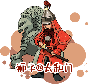 紫禁城内最重要的政治活动场所太和殿太和门,就是以狮子来镇守的。这对青铜狮子一雌一雄,颈悬响铃,肌肉发达,气势雄伟。雄狮脚踩绣球,雌狮脚下有一只幼狮嬉戏,有护卫、避邪、吉祥、装饰的多重寓意和作用。故宫内中现存狮子七对,你可以试着去找找它们都在哪里哦!