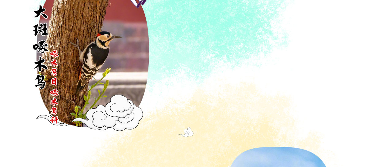 大斑啄木鸟是故宫中体型第二大的啄木鸟,喜欢贴着树干敲击寻找树皮或树干中的昆虫,飞行时速度较慢,飞行轨迹呈波浪状上下起伏。繁殖期4月至7月,繁殖时雄鸟会连续而急促的敲击树干发出一串“笃笃笃……”的声音。每年会凿一个新的树洞做巢,雌雄轮流孵蛋,共同育雏。