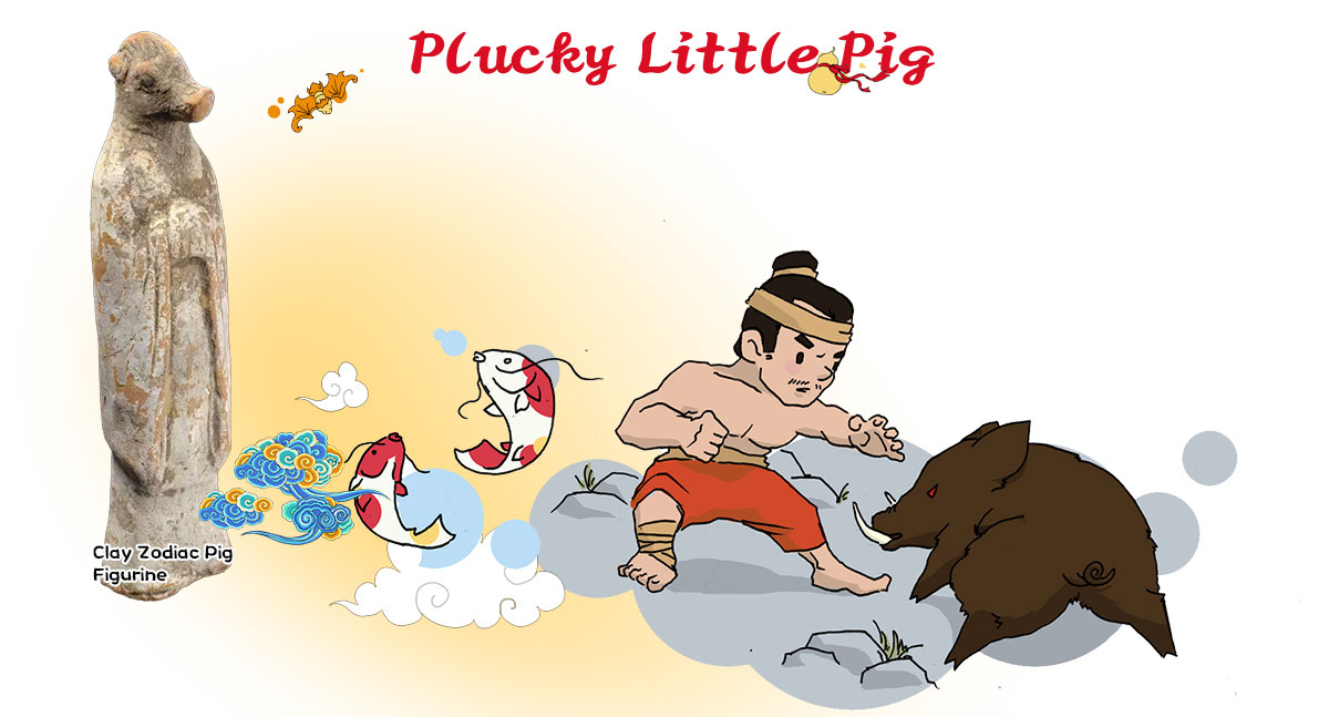 As early as the Palaeolithic era, pigs became part of human life. People hunted wild boar, which were fierce and formidable—so much so that even tigers approached them with caution. Thus, wild boars were seen as symbols of courage. In ancient oracle bone script, the character for "bravery" (敢) is composed of symbols representing "hand"(手) and "wild boar"(亥:野猪), as catching a wild boar bare-handed was considered the ultimate show of courage. Wang Mang (r. 9–23) named his troops the “Ferocious Boar Troops” in the hopes that they would charge forward like wild boars, unstoppable and fierce. In a similar spirit, the Manchu people, who valued bravery, considered wild boars one of their protective deities.