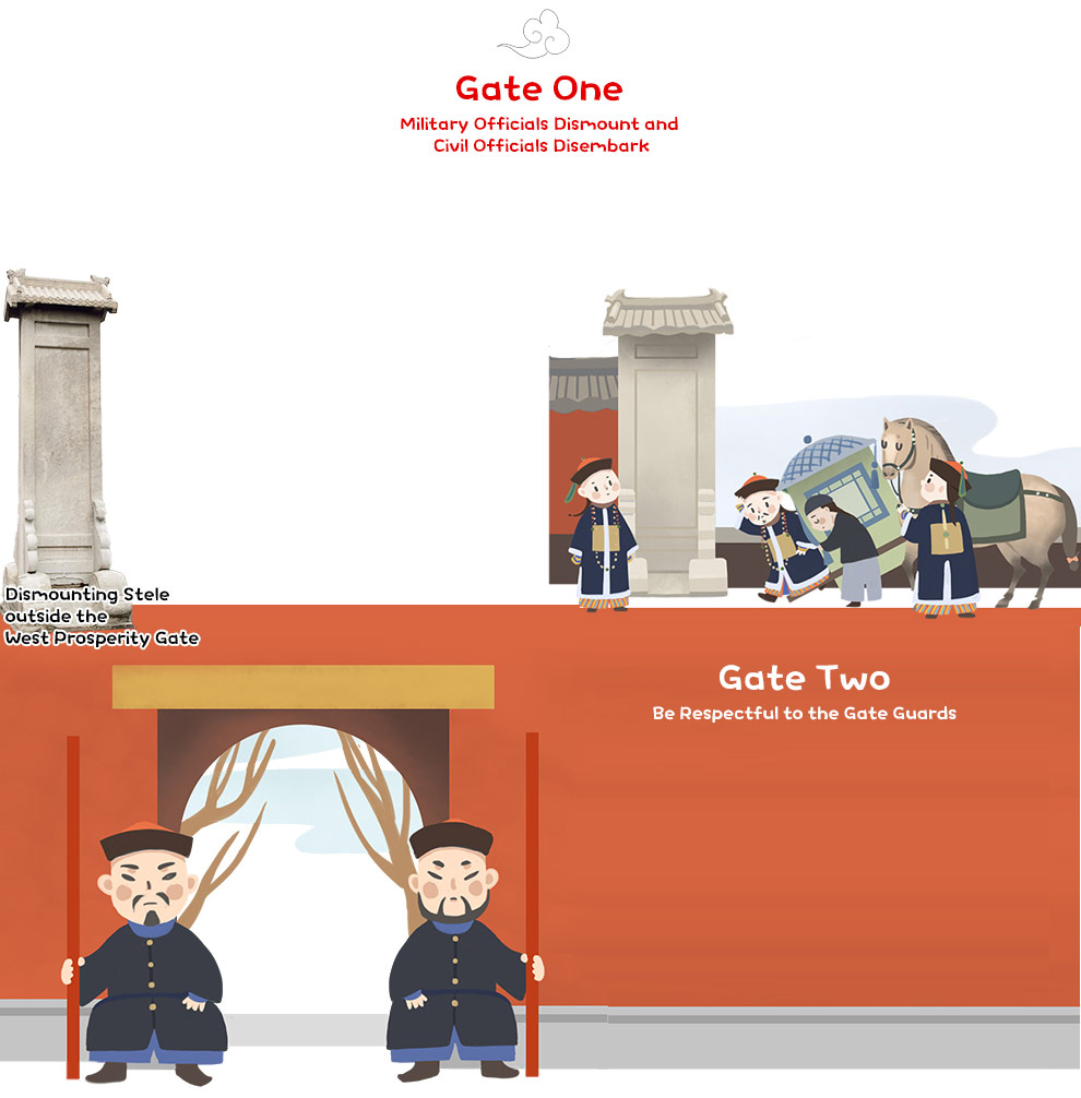 Perhaps you’ve noticed the tall stone tablets at the East Prosperity Gate (Donghua men) and the West Prosperity Gate (Xihua men) of today’s Palace Museum, inscribed with the words "Officials Dismount Here". Originally, such steles were placed outside the north, south, east, and west gates of the Forbidden City. In the Qing dynasty, it was required that when seeing a “dismounting stele” on their way to court, civil officials would get off their sedans, and military officials would dismount their horses before proceeding into the palace on foot. Only the imperial kinsmen of the beizi rank (Prince of the Fourth Rank) or higher and elderly officials with special permission from the emperor were allowed to ride on horseback or sit in a sedan, but only as far as the Arrow Pavilion (Jian ting) from the East Prosperity Gate or the Office of Imperial Household Department (Neiwu fu) from the West Prosperity Gate. Beyond that, all had to proceed on foot to enter the inner court.