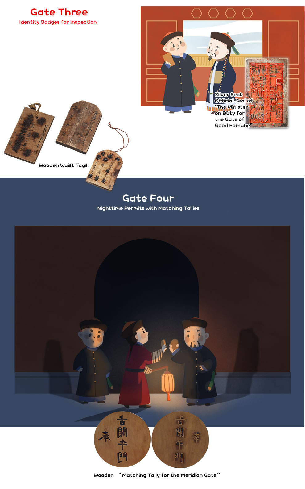 The palace gates typically opened between 4 and 5 AM and closed around 5 or 6 PM. But what if an emergency required someone to enter or exit at night? For that, there was a special permit known as the "matching tally" (Hefu). This permit was split into two halves, carved with the characters for “imperial edict” in yin and yang scripts (the embossed script was called yang while the engraved one was yin), respectively. The yin half was held by the gatekeepers, while the yang half was kept within the inner palace. If someone needed to enter or exit for an urgent matter, they would carry the yang half to the gate, where it would be matched with the yin half before passage was allowed.