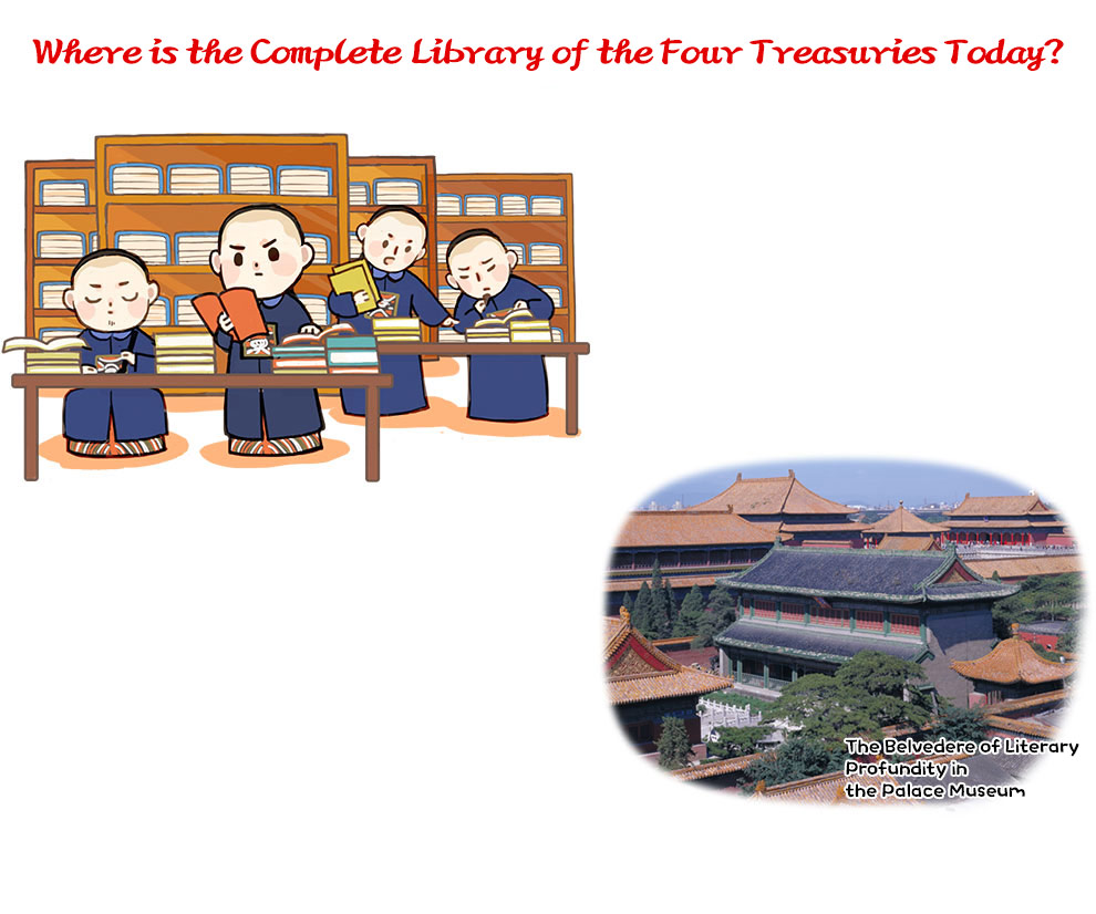 Of the seven copies, the first four were housed in the “Four Northern Libraries”: the Belvedere of Literary Profundity (Wenyuan ge) in the Forbidden City, the Belvedere of Literary Foundation (Wensu ge) in Shenyang, the Belvedere of Literary Flowing (Wenyuan ge) in the Old Summer Palace, and the Belvedere of Literary Delight (Wenjin ge) in the Chengde Mountain Resort. The remaining three copies were placed in the “Three Southern Libraries”: the Belvedere of Literary Convergence (Wenhui ge) of the Daguan Hall in Yangzhou, the Belvedere of Literary Clan (Wenzong ge) of the Jinshan Temple in Zhenjiang, and the Belvedere of Literary Magnificence (Wenlan ge) of the Shengyin Temple in Hangzhou. The Four Northern Libraries were strictly off-limits, while the Three Southern Libraries were open to local scholars for study and transcription. The original copy, also accessible for transcription, was stored in the Hanlin Academy.