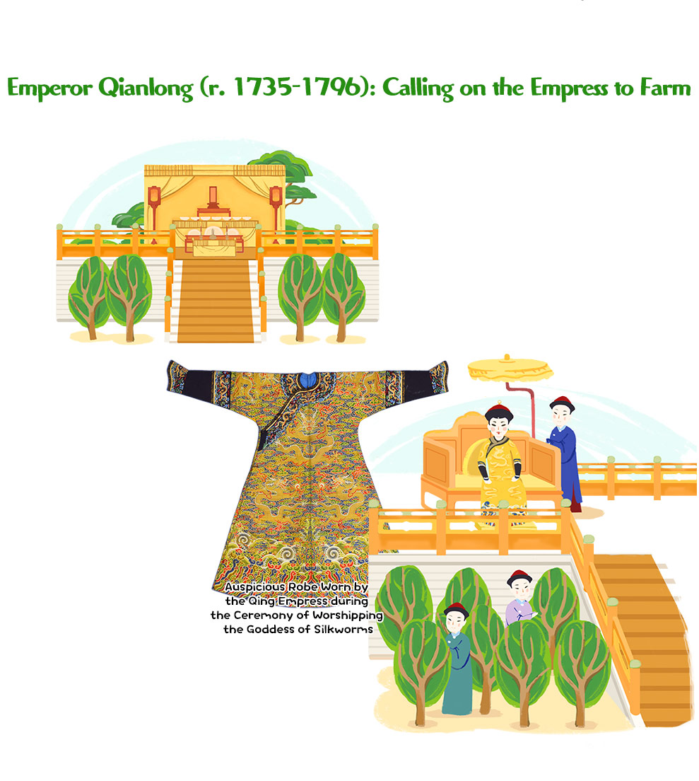 In ancient China, men ploughed and women wove—a division of labour within each household. As the foremost husband and wife of the realm, the emperor and empress followed this model as well. During the spring season, the emperor not only performed sacrifices and ploughed fields but also required the empress to lead a ceremony of worshipping the Goddess of Silkworms, setting an example for women across the empire. This was the highest ritual the empress could perform.