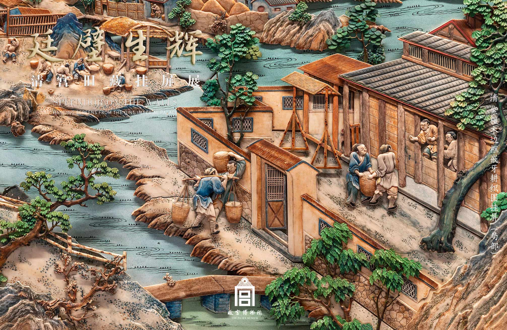 挂屏属于屏风中的一种,主要安设于室内墙面之上,起到装饰与点缀立面空间的作用。清代挂屏的制作手法与艺术水准达到了前所未有的高峰,曾广泛应用于宫廷的大小殿阁之内。故宫博物院现有清宫旧藏挂屏九百余件,是数量最多的一类屏风,其在当时室内陈设中的重要性可见一斑。这些挂屏精美华丽,细节丰富,凝聚了清代手工艺制作技术的精华。当年常悬壁上,虽经岁月浸染,却难掩光辉,今日乃得与大众同赏。