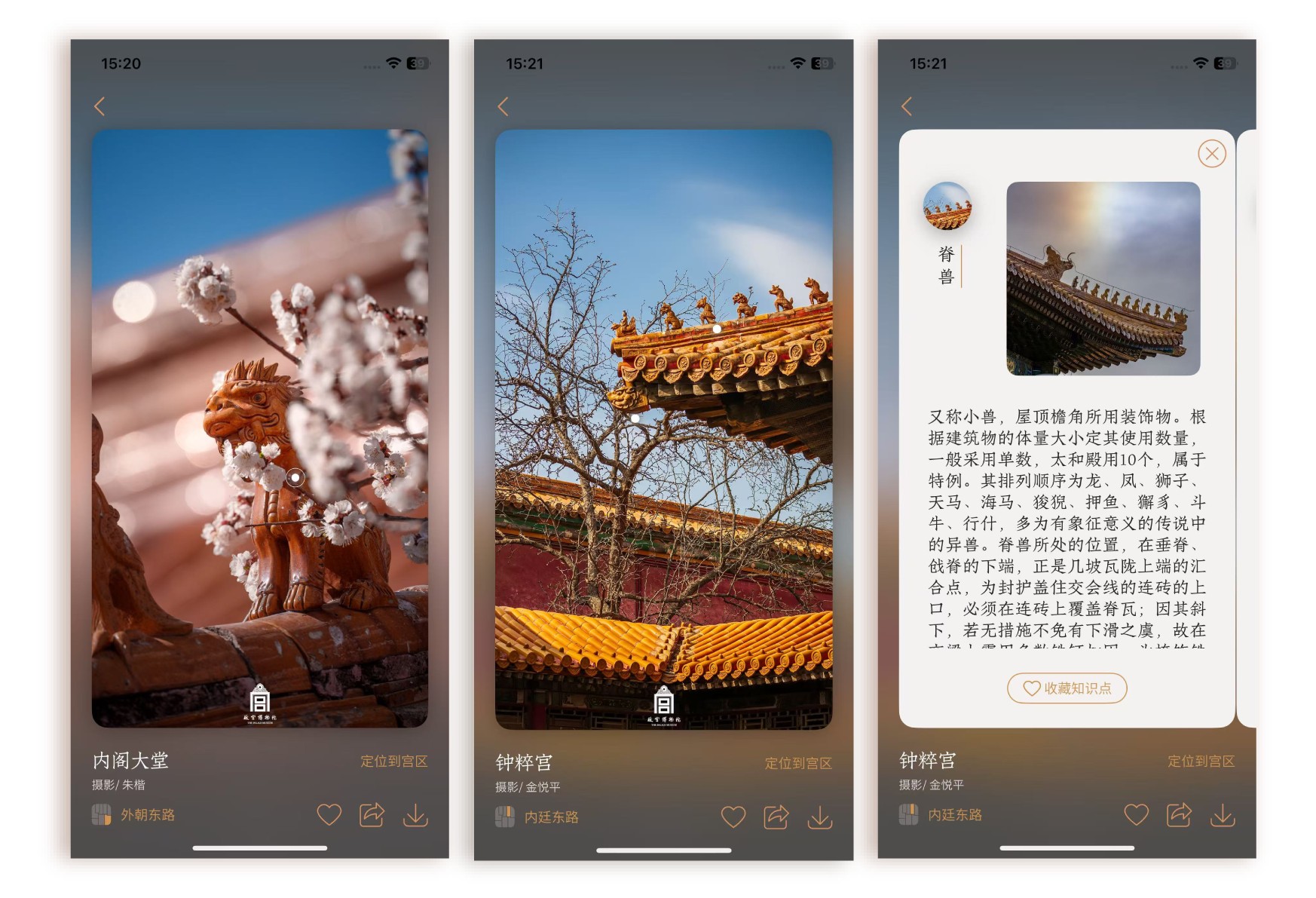 为进一步深化知识服务,新版应用推出了“古建筑知识标签”功能。在浏览高清美图时,建筑的各个构件被标注为可交互的热点,点击即可获取古建筑历史知识。所有知识点均源自故宫博物院的学术研究,确保了内容的权威性。公众不仅可以收藏标签形成个人知识库,更可通过全域搜索,实现对特定建筑信息的“一站式”检索与学习。
