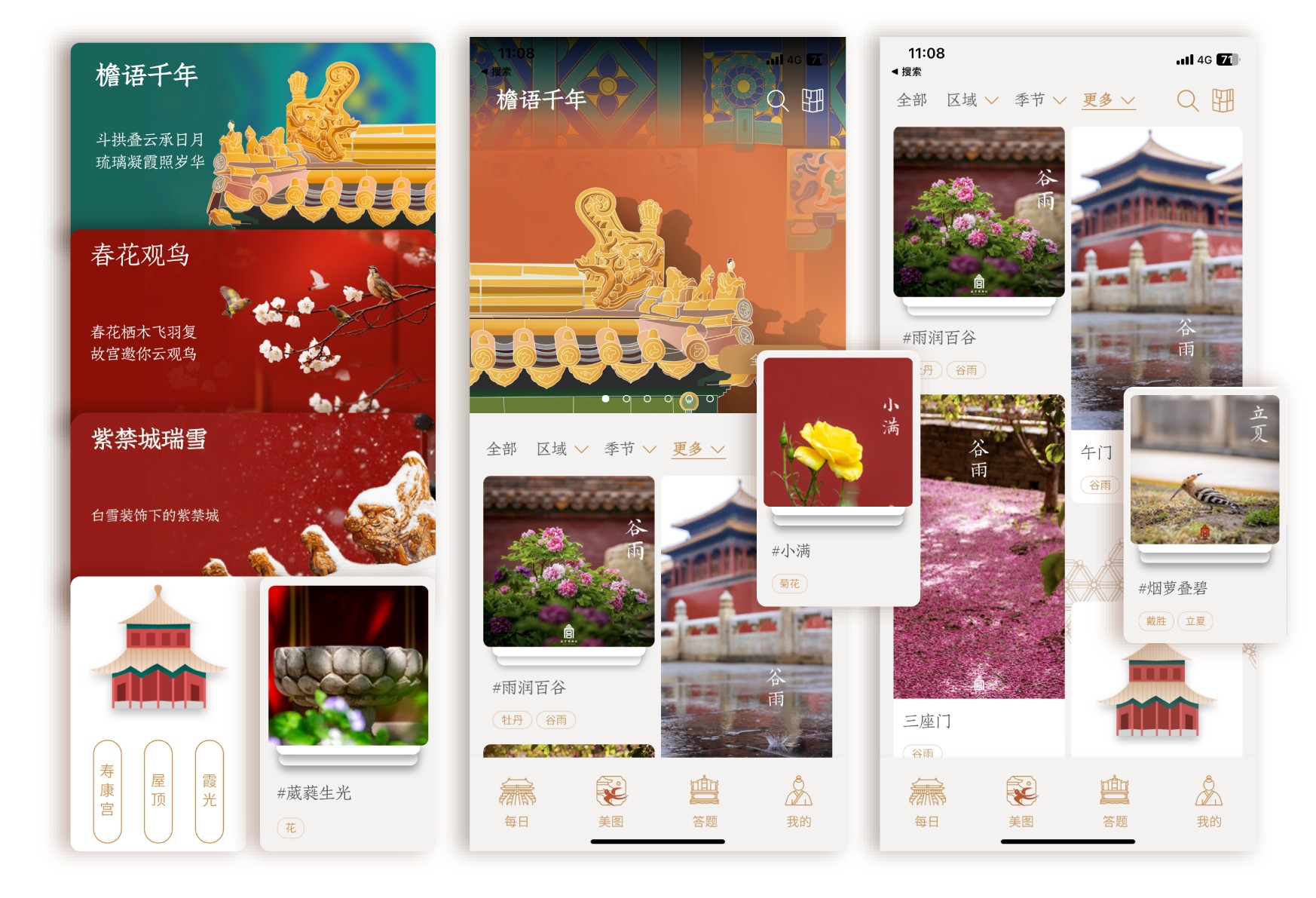 新版《紫禁城365》应用对内容呈现与交互功能进行了全面梳理与优化,引领公众从“看”故宫走向“懂”故宫。应用内收录超3000张官方摄影师拍摄的故宫时令美图,并建立了一套智能标签系统。公众不仅可以通过“建筑细节”、“节气物候”等维度对图片进行分类筛选,还可探索“故宫风物”、“四季美景”等特色专题,实现了从“看”故宫到“赏”故宫的体验升级。