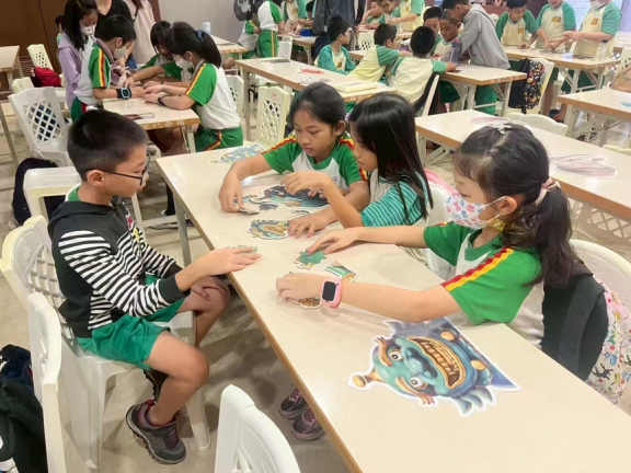 此外,故宫博物院还在此期间同步于佛光山佛陀纪念馆开设了32场主题教育课程,惠及台湾地区青少年877人次。“神兽的苦恼”绘本课、“屋檐下的缤纷色彩”传统美学课用青少年喜爱的方式传递文化内涵。在“神兽的苦恼”绘本课中,孩子们在老师的带领下,阅读小神兽甪端的故事,不仅联动音乐剧演出,了解其背后的文化寓意,更在拼图挑战、情绪模拟、折纸手工等互动环节中,领悟到自信与勇敢的成长道理,感受了积极向上的人生态度。“屋檐下的缤纷色彩”主题课程中,老师为学生普及了故宫中彩画的样式、等级与寓意,还引导学生制作了精致的彩画钥匙链,令大家在动手、绘画和创意中充分感受了古建筑的文化魅力。课程在愉悦、轻松的氛围中为台湾地区青少年加深了对于中华优秀传统文化的理解和印象,在潜移默化之中,为增强两岸民族认同奠定了深厚的底蕴。