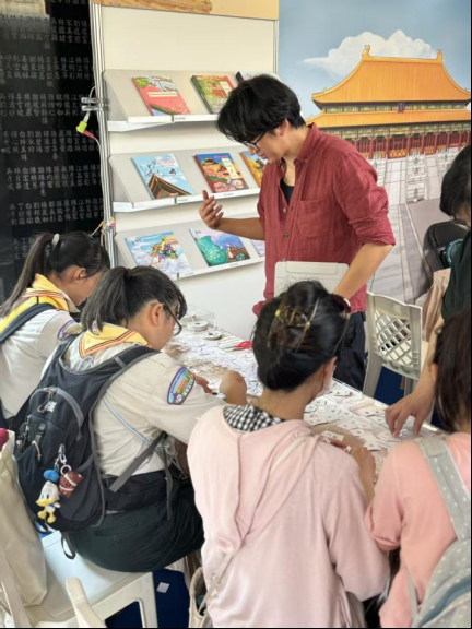 在静态展示区域内,故宫博物院以传统红墙黄瓦元素打造的展位格外醒目。这里不仅展示了《哇!故宫的二十四节气》《我要去故宫》及《了不起的故宫宝贝》等书籍和教育资料的繁体中文版、英文版及多语种版本,还特别设置了“博‘骨’通今”互动打卡区,《清明上河图》互动创作、传统纹样杯垫制作等趣味体验。博“骨”通今甲骨文打卡区通过轻松有趣的问答形式,为观众普及甲骨文知识,增进台湾地区民众对汉字起源发展的理解与认识;“一幅画·一座城”和“蝶寿同春”两项快闪活动,吸引大量观众驻足并踊跃参与,或参照《清明上河图》描绘的市井百态创作自己的“汴京故事”画作,或运用中国传统纹样,亲手装饰精美的陶瓷杯垫。短短五天内,就有超过1500组家庭参与了快闪活动体验,现场人气持续居高不下。