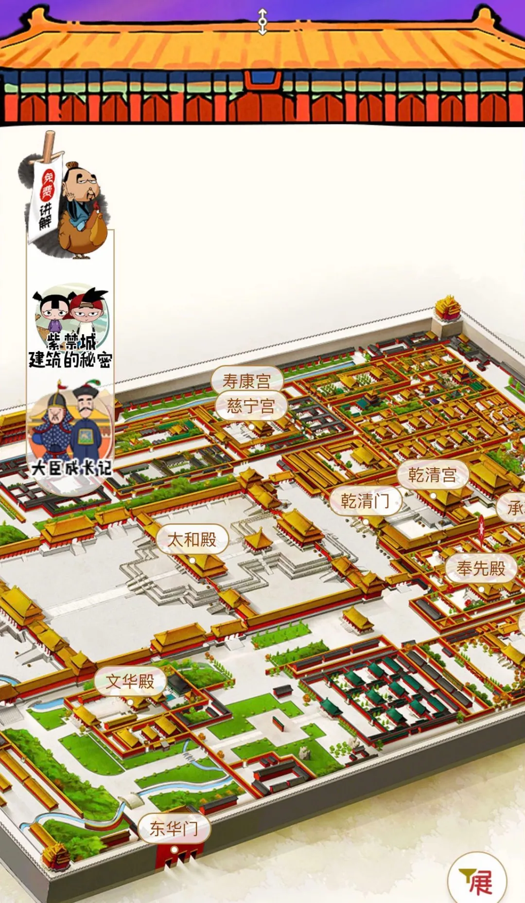 紫禁城里都有哪些宫殿,展览和专馆分别设在什么位置?打开故宫青少网首页,在一幅立体清晰的手绘地图上,所有信息一目了然。
