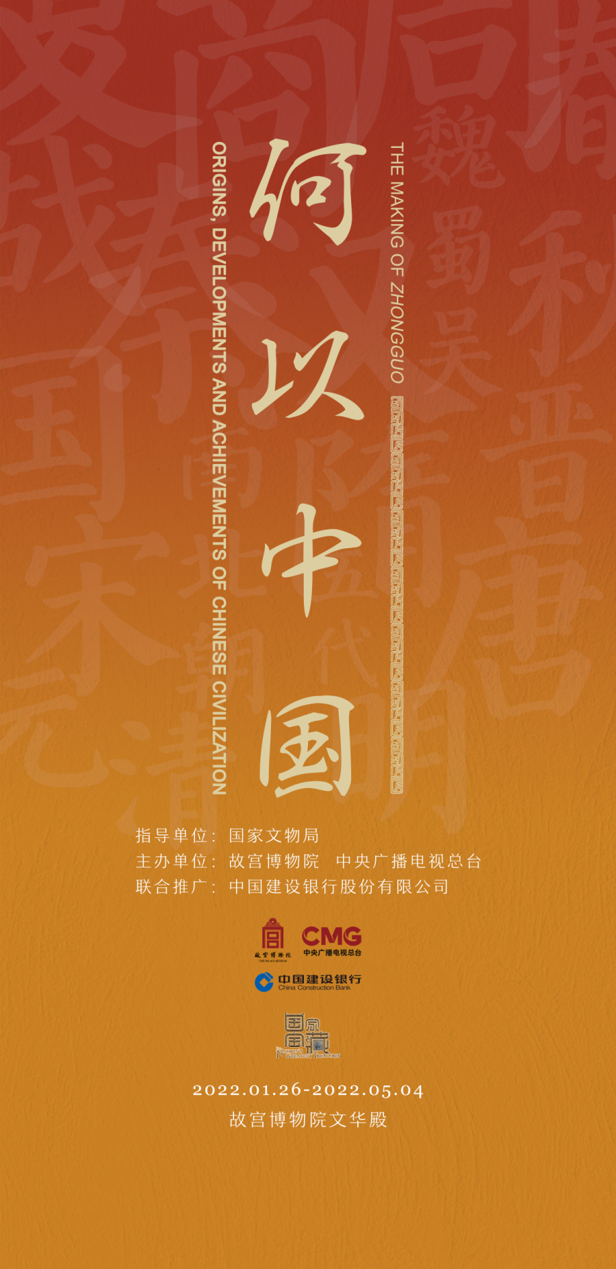 “何以中国”展位于故宫博物院文华殿展厅,展期为2022年1月26日至5月4日。根据当前疫情防控形势,按照预约、限流、错峰原则,展览实行预约入场,全天限额3000人,额满为止。观众可通过故宫博物院网络售票网站(https://gugong.ktmtech.cn/)和微信公众号“故宫博物院观众服务”,使用二代身份证或护照信息进行实名预约。