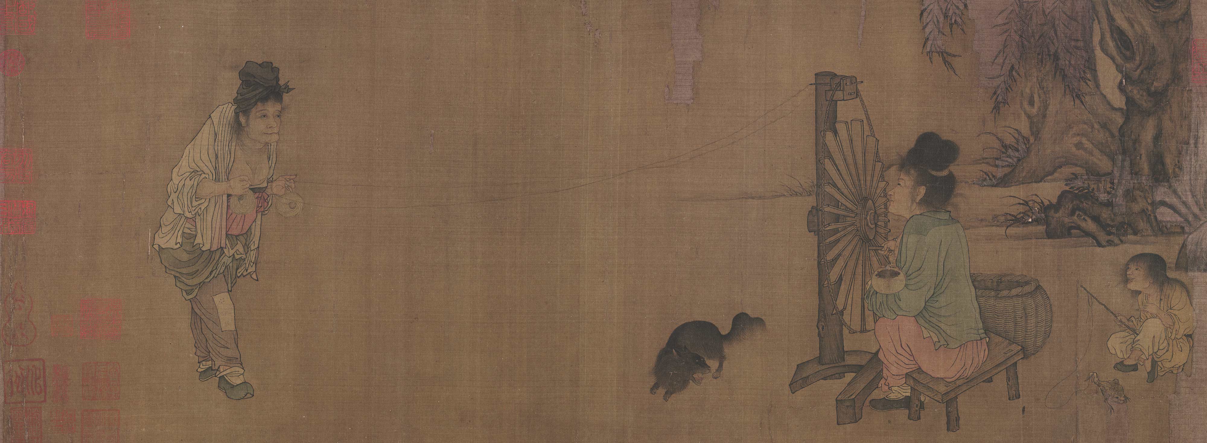 纺车是利用人力将丝、麻等物抽丝延长的工具,在我国已有久远历史。此绘村妇纺线场景。前人论此画学五代南唐画家周文矩“战笔描”,线条瘦劲,多折笔,设色淡雅,童稚披发戏蟾,具有吉祥寓意。纺车生产以家庭为单位,后逐渐演变成具有美好寓意的“丝纶图”范式。曾经南宋贾似道、元赵孟頫等人递藏。幅后有清刘绎、陆心源及现代张大千题跋。
