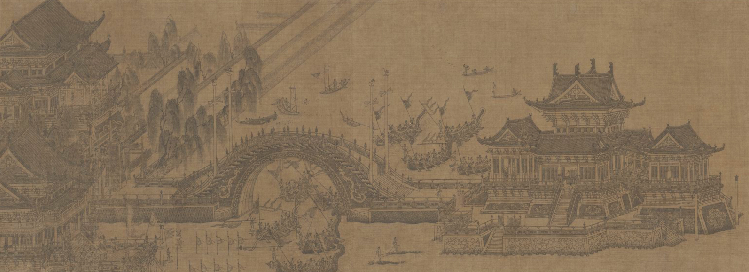 相传龙舟竞渡与屈原有关,或源自吴越等地的古老风俗,是古代非常盛行的水嬉活动。金明池故址在今河南开封,开凿于后周,北宋太平兴国二年(977)曾大规模修缮,是北宋的皇家池苑。皇帝常在此教演水军、举行龙舟夺标、宴饮等活动。每年农历三月一日至四月八日,开放金明池与琼林苑,允许游人自由出入。