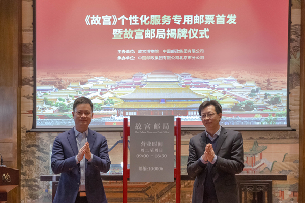 故宫博物院党委副书记、副院长罗先良与中国邮政集团有限公司北京市分公司副总经理范小荣共同为故宫邮局揭幕