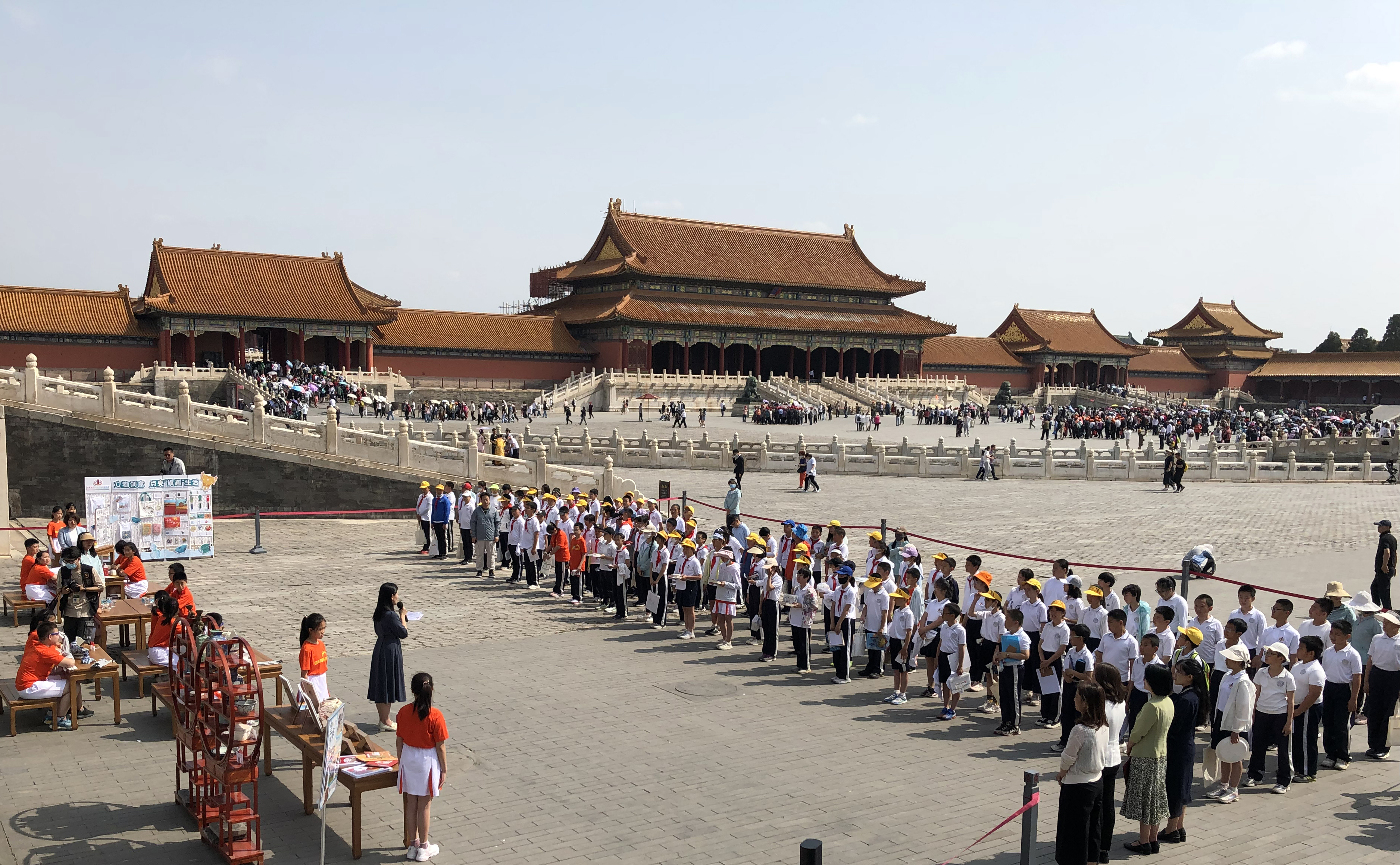 来自中关村一小西二旗分校的同学们,在太和门广场西侧的教育中心外,参加了一堂特殊的综合实践课程。作为2023年该校开设的《文物探究项目式学习创新课程》的延伸,老师带领同学们尝试运用科学的方法重新解构文物,探寻其中蕴含的文化要素与背后的历史文化内涵。