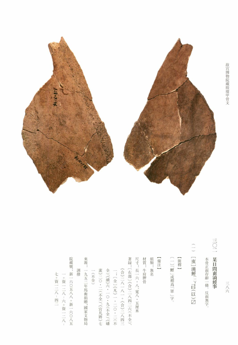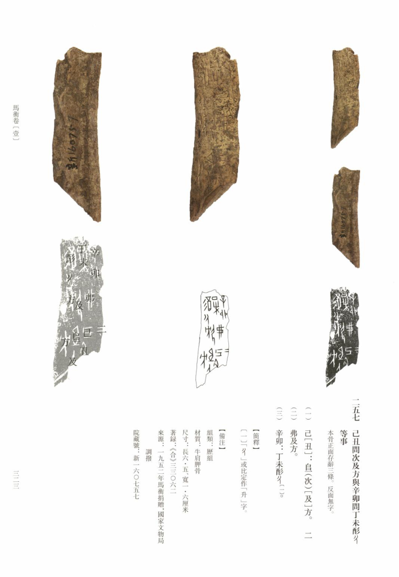 《故宫博物院藏殷墟甲骨文》“马衡卷”“谢伯殳卷”,是“古文字工程”故宫博物院平台阶段成果中的核心。故宫在根据自身文物收藏特点,按藏家整理所藏甲骨的同时,努力收录同源甲骨及相关旧拓。《马衡卷》附有马衡亲手制作的“凡将斋藏甲骨文字”“国学门藏甲骨文字”旧拓。《谢伯殳卷》包含《故宫博物院藏谢伯殳甲骨》和《华东师范大学藏甲骨》两种。每卷书皆附以著录情况一览表,既保证了资料的完整性,又便于了解此批甲骨流传递藏始末、今昔信息比勘和学术研究。在体例方面也多有创新,是一部优秀的甲骨著录书。