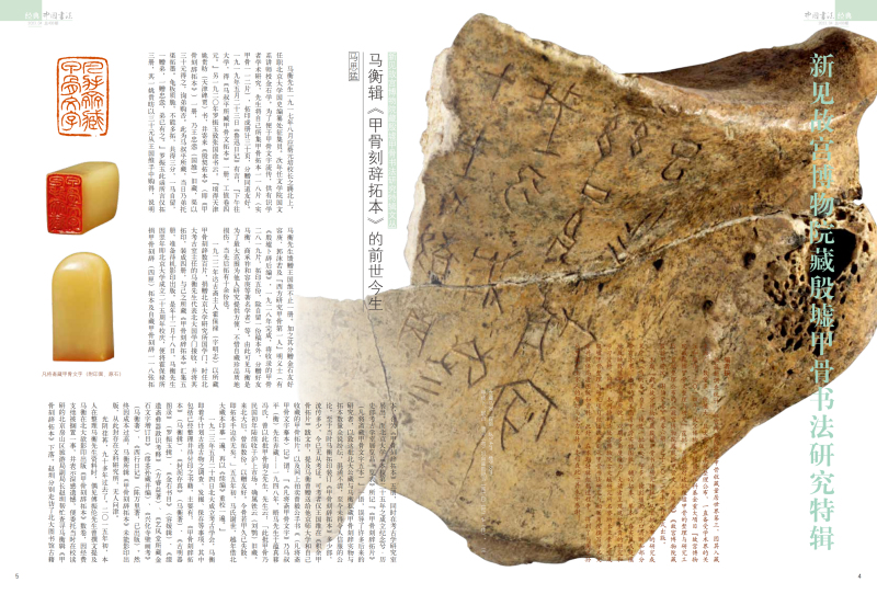 《中国书法》2023年第4期“新见故宫博物院藏殷墟书法研究特辑”以首批公布的研究成果中以《故宫博物院藏殷墟甲骨文》马衡卷为主,精选一批骨板较大、字数较多,契刻遒劲、字口清晰及部分涂朱、涂墨的高清甲骨实物图版,辅以拓本、摹本,真实且成规模地反映殷墟甲骨书法原貌。同时,刊登了甲骨项目组团队从甲骨书法研究与相关角度撰写的学术论文。值得一提的是,本期还刊布了马衡先生《凡将斋甲骨刻辞》的部分原拓书影及马衡先生之孙马思猛先生撰写的介绍马衡先生辑录《甲骨刻辞拓本》的相关内容。