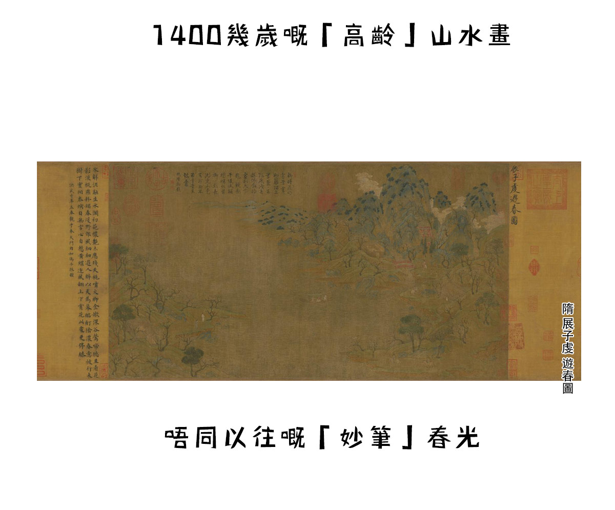 《遊春圖》呢幅畫真係唔簡單!人哋都話「絹保八百,紙壽千年」,意思係絹本書畫作品大概保存期限係800年,紙本書畫就大概有1000年嘅壽命。但係《遊春圖》就突破咗呢句俗語所講嘅「壽命」,作為絹本畫作,據傳經已有1400幾歲嘅高齡!雖然呢幅畫嘅時代同作者仲有爭議,但係不可否認佢仍然係考察同認識早期山水畫發展嘅珍貴資料。