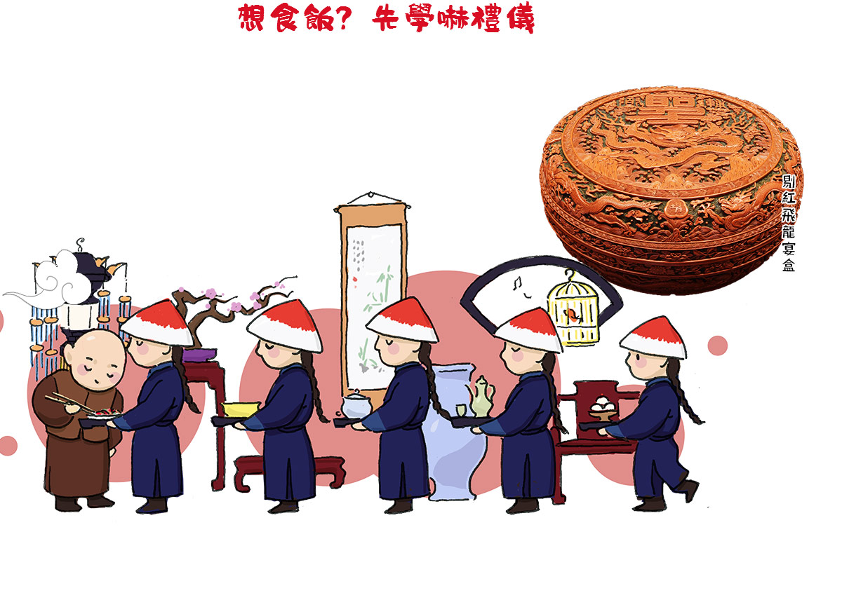 中國係禮儀之邦,對於皇室嚟講,禮儀更加係隨處可見。喺現代社會,如果覺得肚餓,你需要做咩呢?洗洗手,乖乖哋坐喺餐台旁邊等阿媽開飯。但係喺皇室,食飯要遵守好多規矩。由上至皇帝,下至妃嬪、貴人,次次食飯都要按照禮儀流程進行,呢個流程叫做「賜食」或者「進食」。皇帝食飯前,要先向皇太后進供食品菜餚,皇后、妃嬪、親王、皇子食飯前都要向皇帝進膳,用嚟表達尊敬長輩、忠君愛國嘅意思;而皇太后亦都要向皇帝賜食,表示關愛晚輩;皇帝食完飯,仲要將自己膳桌上嘅菜餚、饽饽、點心等賞賜俾後妃皇子們。不過,大部分時間,呢啲流程都係由宮人幫主子安排好,主子只需要知悉並同意就得啦。