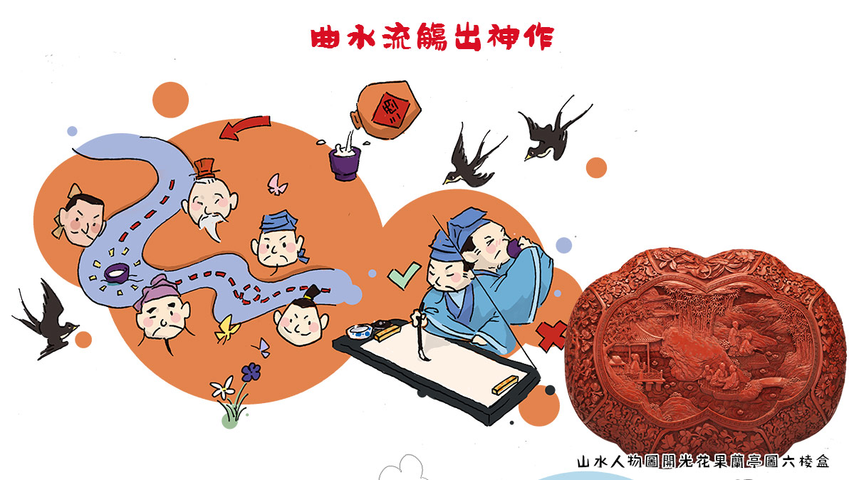 魏晉時代,文人雅士們喺上巳節臨水宴飲,並且由此衍生出一項重要嘅遊戲——曲水流觴(soeng1)。曲水係指彎彎曲曲嘅溪流,觴係古代飲酒用嘅一種杯子。呢個遊戲點玩呢?就係將裝滿酒嘅酒杯放喺彎彎曲曲嘅溪水入面,順水漂流,喺邊個面前打轉或者停低,邊個就要即興作一首詩,作唔出就要罰酒喇。