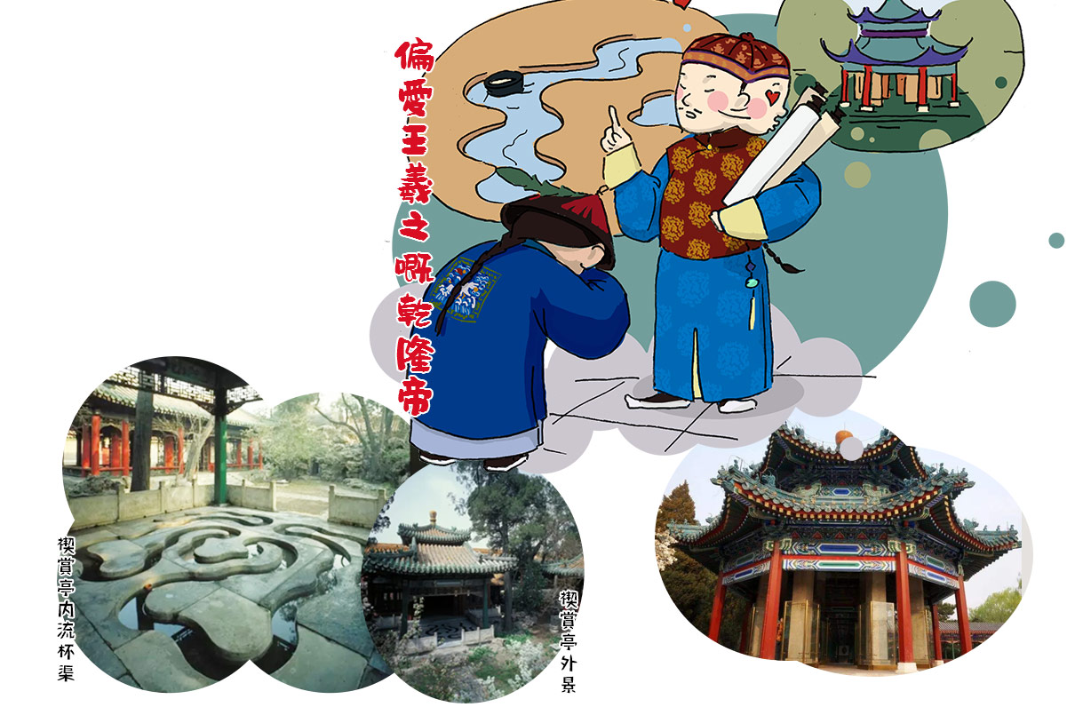 諗到書聖王羲之同朋友喺「崇山峻嶺,茂林修竹,清流激湍」之間飲酒做詩,乾隆皇帝無限嚮往。於是,佢命人喺紫禁城嘅寧壽宮花園入面修建咗一座「禊(hai6)賞亭」,並且喺亭內鑿石為渠,渠長27米,曲回盤折,取「曲水流觞」之意,稱為「流杯渠」。乾隆皇帝成日同臣子們,喺度一齊體驗臨流賦詩嘅樂趣。