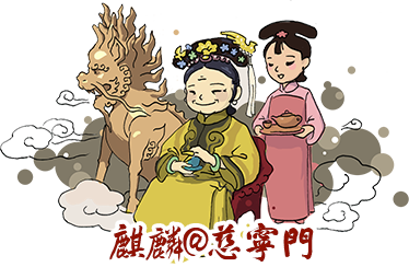 喺慈寧宮嘅正門慈寧門前,有一對鎏金麒麟雄踞喺路邊。佢哋麟發上耸、雙目前視、昂首挺胸、威風凜凜。慈寧宮係皇太后、太妃頤養天年嘅地方,大門外設置麒麟,係希望居住喺度嘅人可以平安祥和。睇,呢個亦體現咗皇帝敬老養老嘅美德。