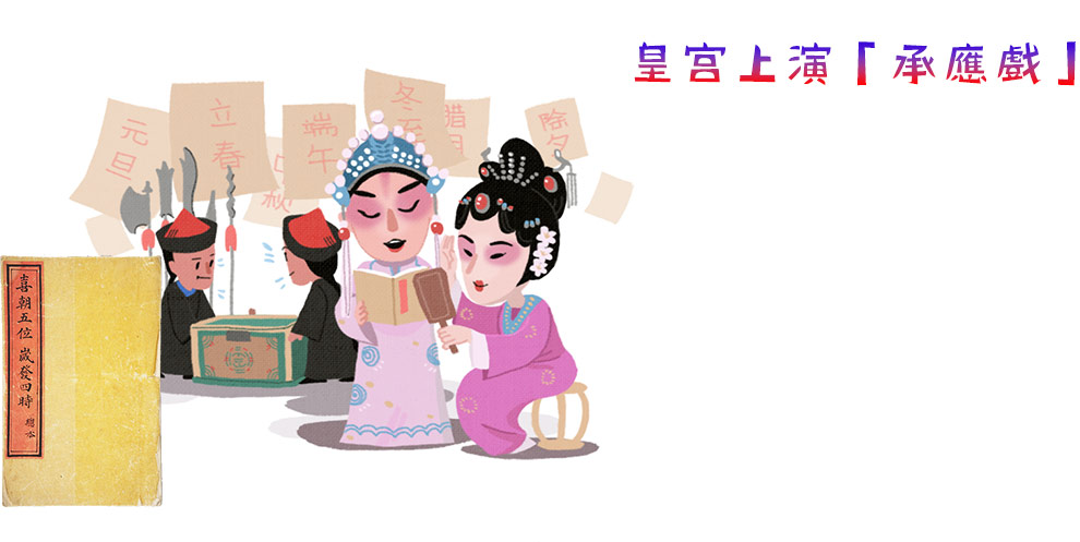 好似宜家我哋有春節聯歡晚會、元宵節晚會、中秋節晚會咁,喺宮廷入面,每個節日都有固定嘅劇目上演,呢個就叫做「月令承應」制度。另外,喺皇帝大婚、皇子誕生、帝后生日、外國使臣來訪等重要日子,都要由皇家劇團進行唔同等級、唔同規模嘅演出,呢個就叫做「慶典承應」制度,全部都係乾隆皇帝制定嘅。