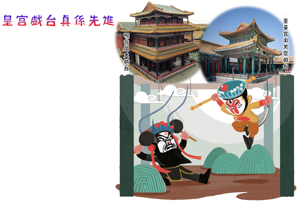 為咗承應好呢啲吉祥大戲,紫禁城入面仲陸續修建咗大大細細好多座戲台劇場。例如上演元旦戲劇嘅重華宮漱芳齋戲台就係皇帝同太后嘅宮廷家宴中最常用嘅,戲台上層設有升降轱轆,可以升降道具,非常華麗。
